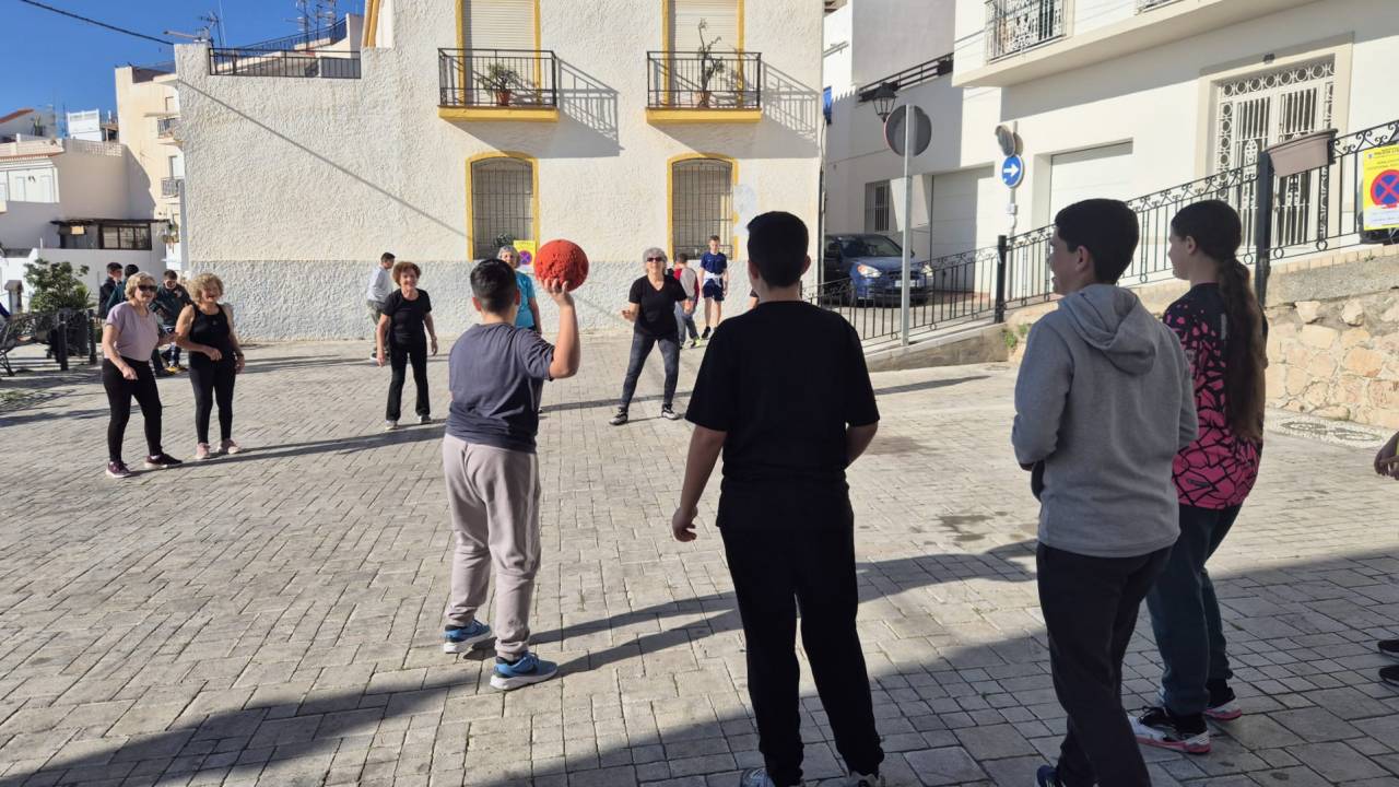 La jornada intergeneracional ha comenzado en el Centro de Mayores, donde los más veteranos han explicado cómo eran los juegos de su infancia, para trasladarse después al Casco Antiguo y ponerlos en práctica